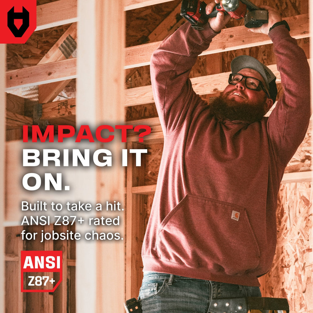 - MADE TO TAKE A HIT. Impact-tested, ANSI Z87.1-rated polycarbonate lenses meant to survive the job.