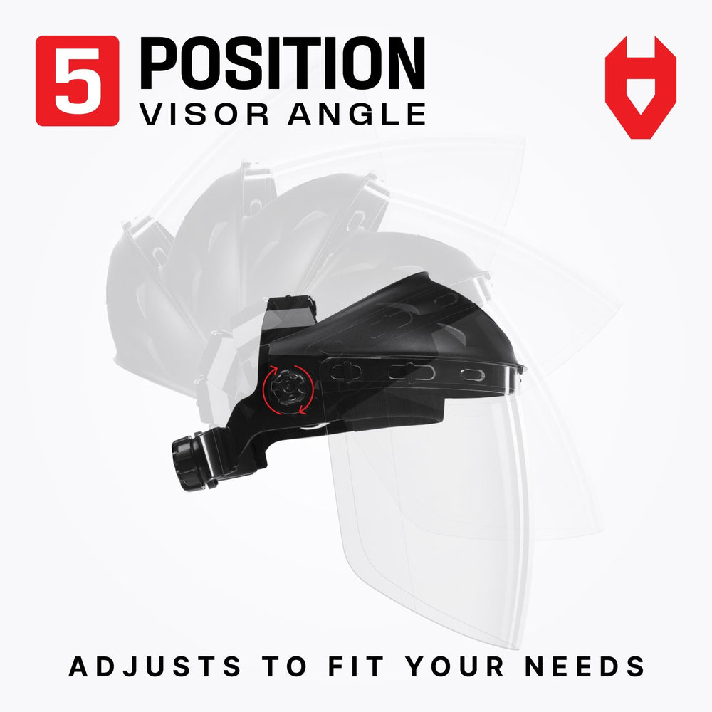 - FULLY ADJUSTABLE — For optimal comfort and safety, this protective face shield for woodworking features a unique ratchet knob and pin lock system for a secure fit. Customize the visor angle with 4 distinct adjustment positions to suit your preference.