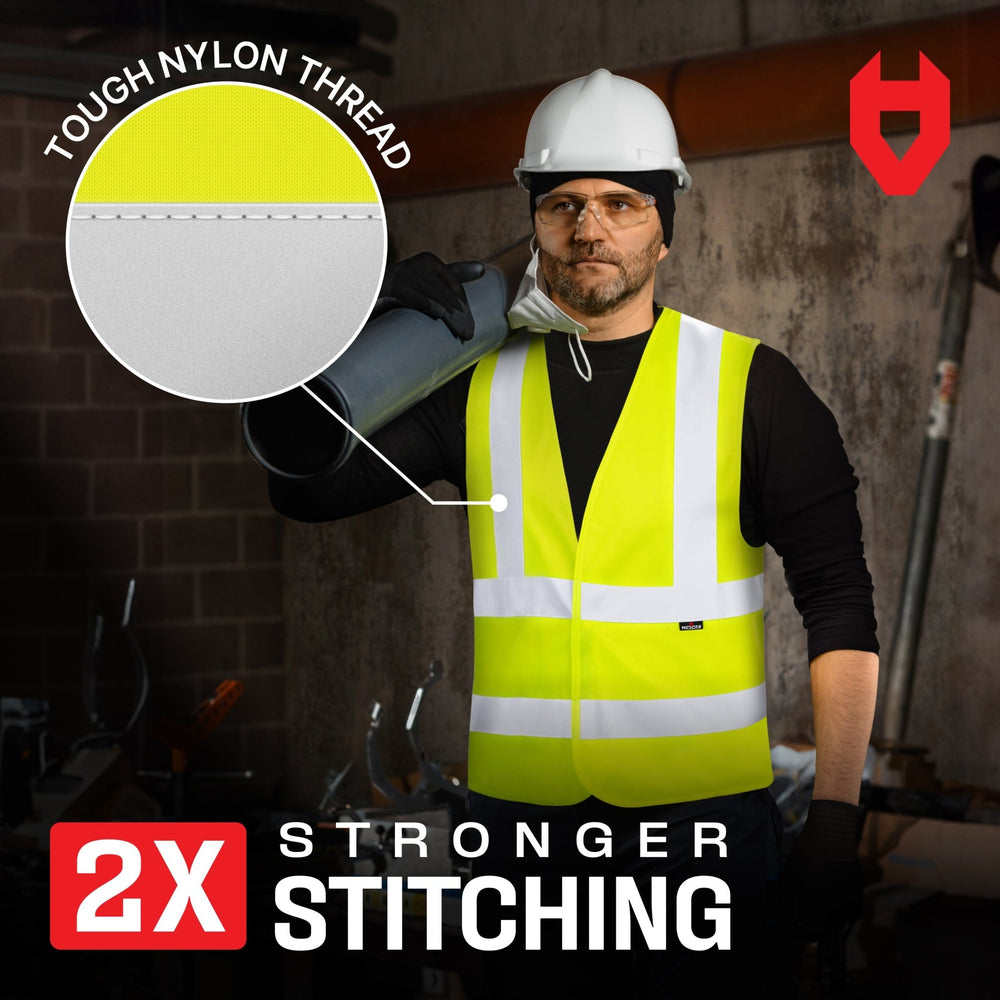 - DURABLE WORKWEAR — Built to last, this reflective vest for men and women is reinforced with nylon stitching, 2X stronger than regular cotton thread. The overlocked stitching on the inside of this traffic vest reflective makes it extra durable.