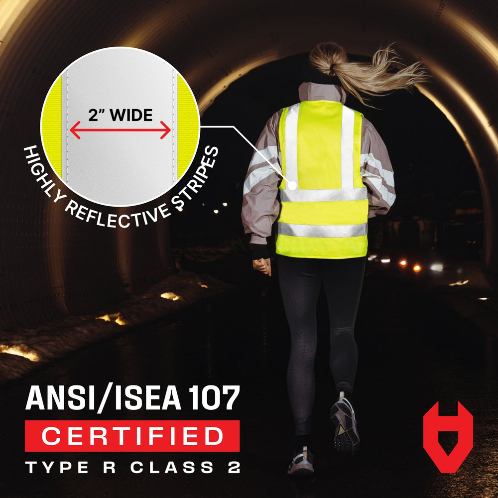 - 360° REFLECTIVE STRIPES — Stay safe even in low light. This yellow vest for men has 2" wide stripes on the front and back to ensure visibility in all weather and lighting conditions. And it's ANSI-certified as well, making this class 2 safety vest suitable as a neon construction vest for men operating near roadways.